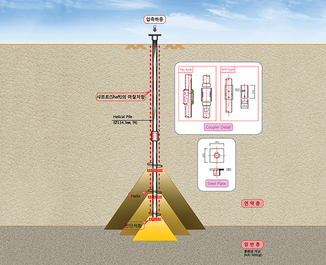 나선형 회전운동을 통해 주면 마찰과 선단지지를 함으로써 지지력 확보