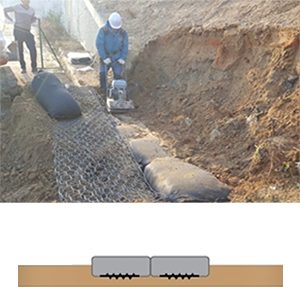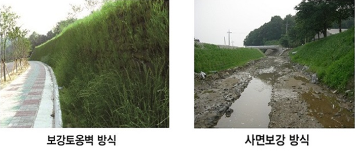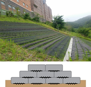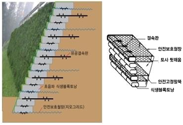 - 보강재를 이용한 보강토공법으로 옹벽을 형상화하고 벽체표면은 토사를 채운 식생토낭을 결속하여 쌓음으로써 옹벽 전면에 식생이 가능토록 한 공법